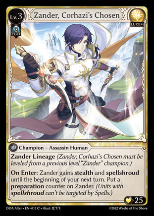 On Enter: Zander gains stealth and spellshroud until the beginning of your next turn. Put a preparation counter on Zander. (Units with spellshroud can't be targeted by Spells.)